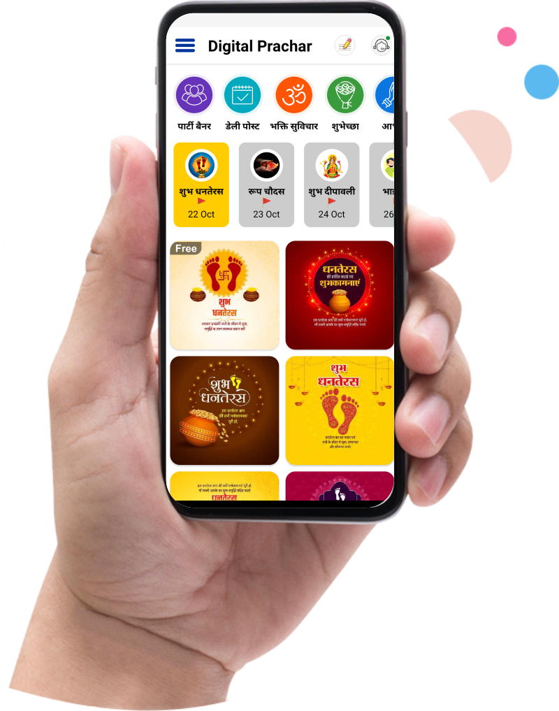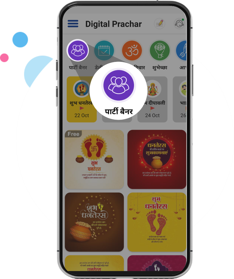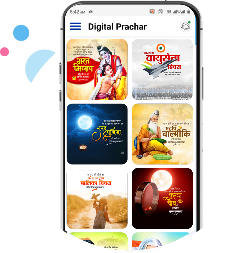 डिजिटल प्रचार App आपको सभी पर्व, त्यौहार, राष्ट्रीय अंतरराष्ट्रीय, ट्रेंडिंग इवेंट पर सोशल मीडिया डिजाईन उपलब्ध करता है, यह आपको कुछ ही क्लिक पर सोशल मीडिया बैनर बनाने की क्षमता